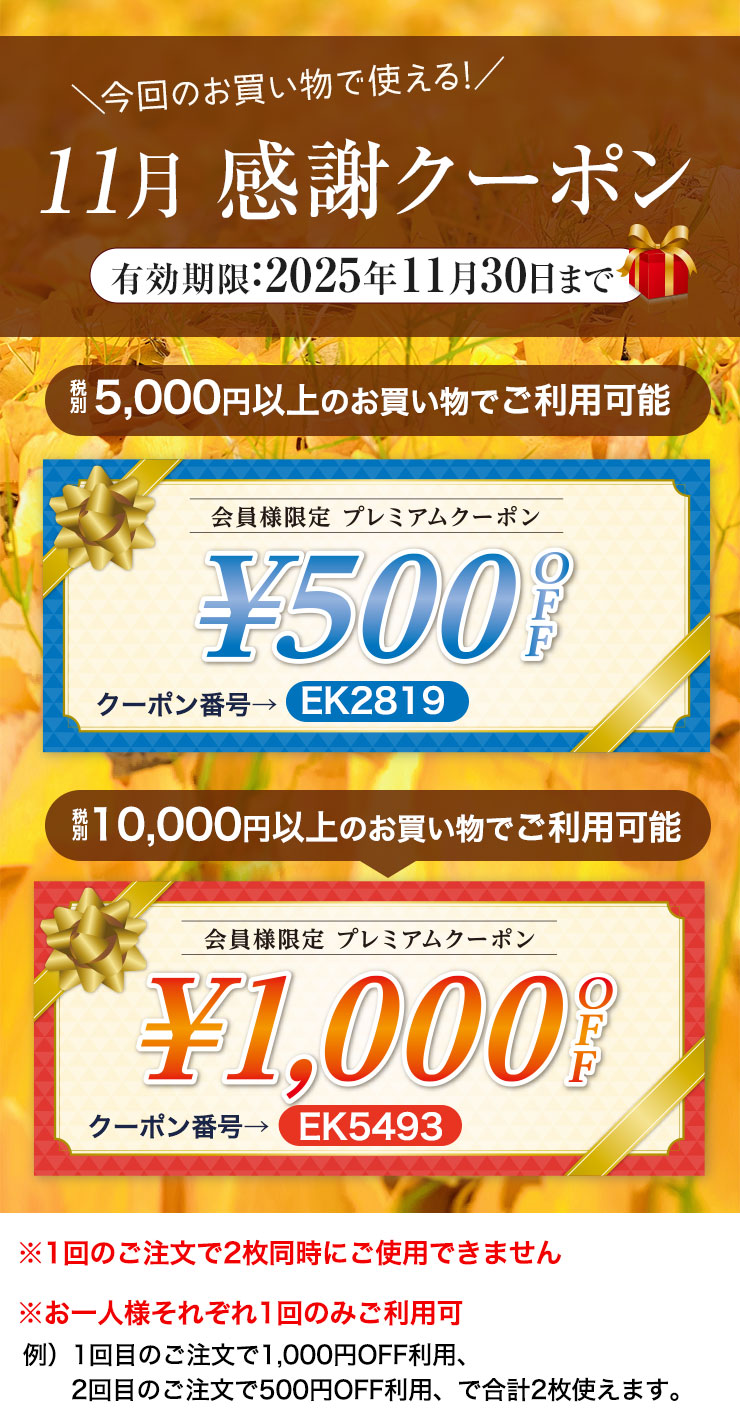 日頃のご愛顧への感謝を込めて、期間中、一度に税別5,000円以上購入されたお客様に「500円クーポン1枚」、税別10,000円以上購入されたお客様には「1,000円クーポン1枚」をプレゼントさせていただきます。クーポンは本日のお買い物にご利用できます!