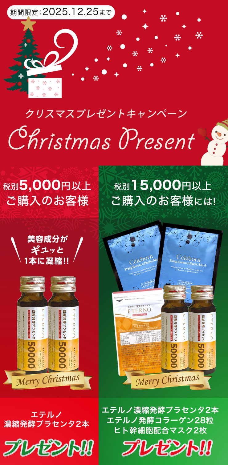 日頃のご愛顧への感謝を込めて、期間中、一度に税別5,000円以上ご購入されたお客様に「エテルノ濃縮発酵プラセンタ2本」を、税別15,000円以上ご購入のお客様には「クリスマス豪華5点セット」をプレゼントさせていただきます。