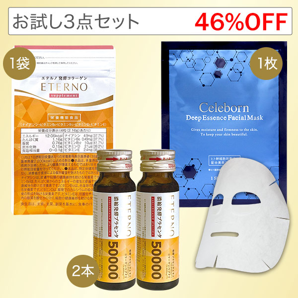 お試し3点セット(発酵コラーゲン28粒+プラセンタ2本+シェリボーンマスク1枚)(P)