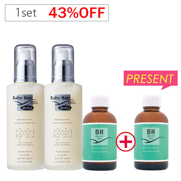 通常のムダ毛お手入れジェル「ベビーヘアープレミアムEX120ml×2本」、より固いムダ毛へのピンポイント液「BHピュア50ml×1本」セットです。
