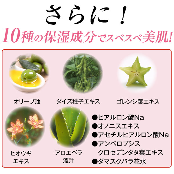 水、BG、DPG、PG、グリセリン、ベタイン、尿素、グリシン、セイヨウオトギリソウ花エキス、ハマメリス葉エキス、アルニカ花エキス、セイヨウシロヤナギ樹皮エキス、ラレアディバリカタエキス、ダイズ種子エキス、加水分解ダイズタンパク、プラセンタエキス、サリチル酸、メントール、レシチン、PEG40水添ヒマシ油、クエン酸Na、クエン酸、ペンテト酸5Na、メチルパラベン