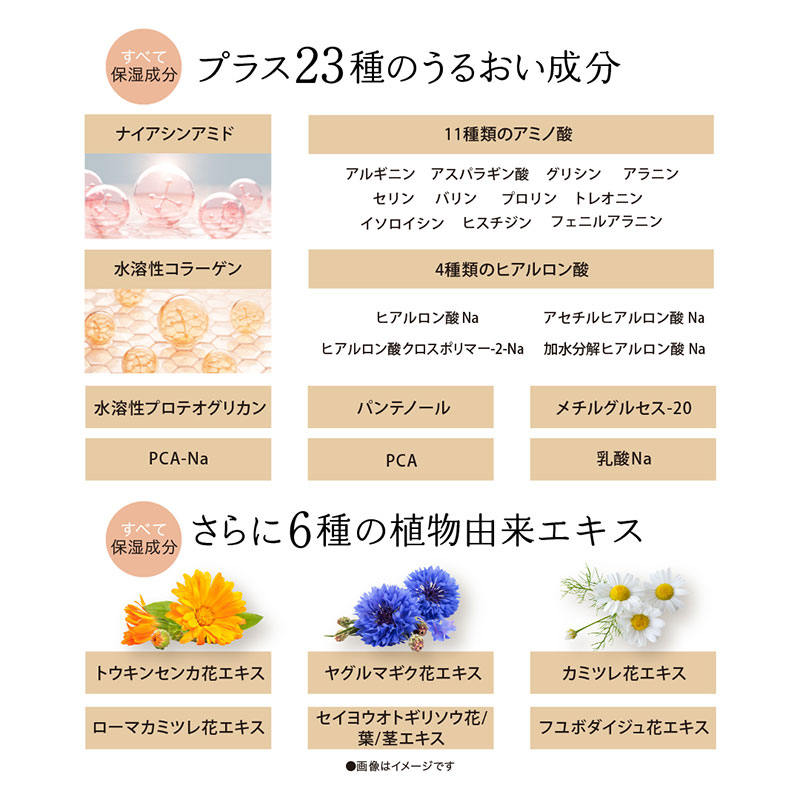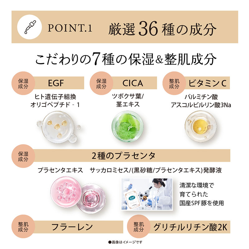 • 水、BG、グリセリン、プラセンタエキス、ヒト遺伝子組換オリゴペプチド‐1、パルミチン酸アスコルビルリン酸3Na、ナイアシンアミド、アセチルヒアルロン酸Na、ヒアルロン酸Na、ヒアルロン酸クロスポリマー-2-Na、加水分解ヒアルロン酸Na、水溶性コラーゲン、水溶性プロテオグリカン、フラーレン、パンテノール、グリチルリチン酸2K、ツボクサ葉/茎エキス、ローマカミツレ花エキス、トウキンセンカ花エキス、ヤグルマギク花エキス、カミツレ花エキス、セイヨウオトギリソウ花/葉/茎エキス、フユボダイジュ花エキス、サッカロミセス/(黒砂糖/プラセンタエキス)発酵液、メチルグルセス‐20、PCA-Na、PCA、乳酸Na、アルギニン、アスパラギン酸、グリシン、アラニン、セリン、バリン、プロリン、トレオニン、イソロイシン、ヒスチジン、フェニルアラニン、ペンチレングリコール、エチルヘキシルグリセリン、カプリリルグリコール、PVP、水添レシチン、コレステロール、ココイルサルコシンNa、イソステアリン酸PEG-25グリセリル、キサンタンガム、カルボマー、エタノール、フェノキシエタノール、水酸化K、クエン酸Na、クエン酸