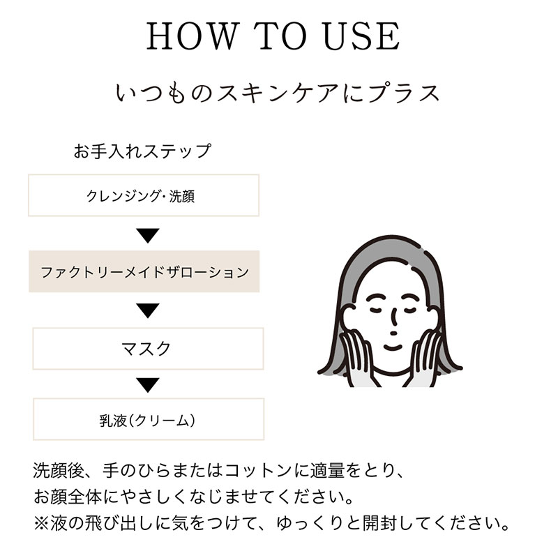 洗顔後、手のひらまたはコットンに適量をとり、お顔全体にやさしくなじませてください。
