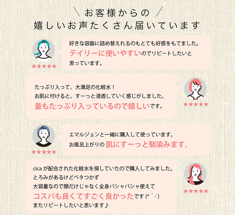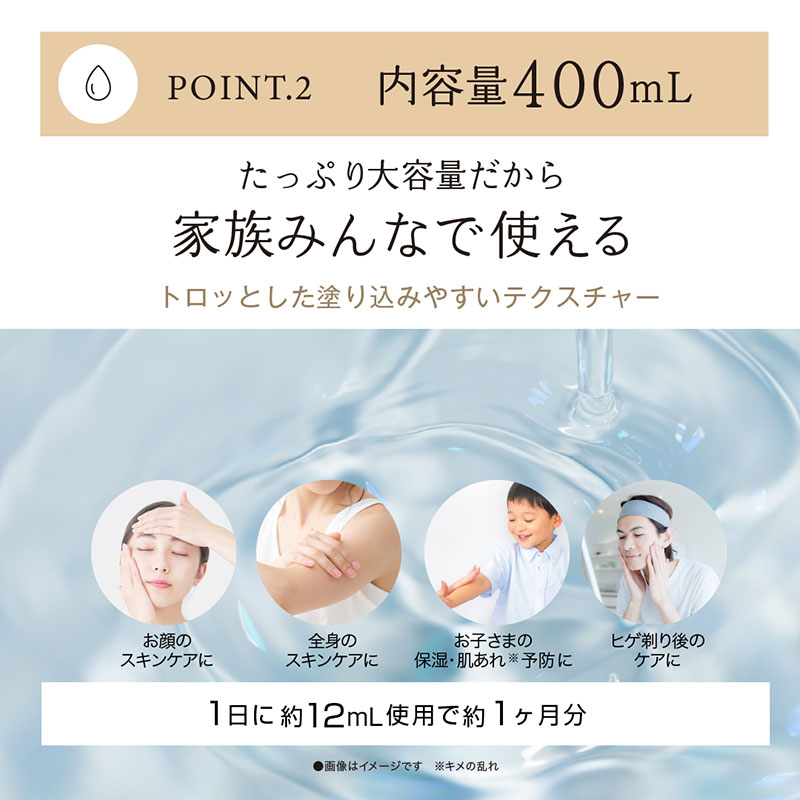 EGF、CICA、ビタミンC、プラセンタなど7種の保湿&整肌成分、さらに23種のうるおい成分を配合したもっちりぷるぷるを実感できる大容量ローションです。