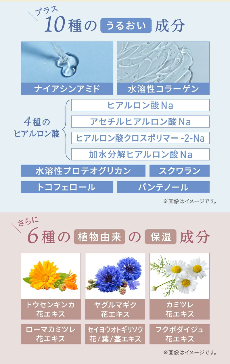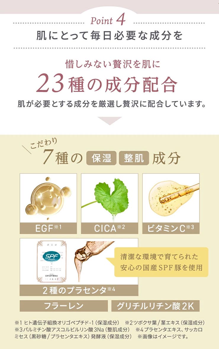 • 水、BG、グリセリン、プラセンタエキス、ヒトオリゴペプチド-1、パルミチン酸アスコルビルリン酸3Na、ナイアシンアミド、アセチルヒアルロン酸Na、ヒアルロン酸Na、ヒアルロン酸クロスポリマー-2-Na、加水分解ヒアルロン酸Na、水溶性コラーゲン、水溶性プロテオグリカン、フラーレン、トコフェロール、パンテノール、グリチルリチン酸2K、ツボクサ葉/茎エキス、ローマカミツレ花エキス、トウキンセンカ花エキス、ヤグルマギク花エキス、カミツレ花エキス、セイヨウオトギリソウ花/葉/茎エキス、フユボダイジュ花エキス、スクワラン、(スチレン/ビニルピロリドン)コポリマー、ペンチレングリコール、トリ(カプリル酸/カプリン酸)グリセリル、エチルヘキシルグリセリン、カプリリルグリコール、PVP、ソルビン酸、サッカロミセス/(黒砂糖/プラセンタエキス)発酵液、イソステアリン酸PEG-25グリセリル、PEG-40水添ヒマシ油、キサンタンガム、カルボマー、フェノキシエタノール、アルギニン、クエン酸Na、クエン酸