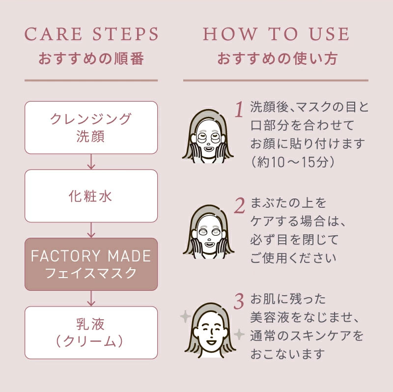 洗顔後、マスクの目と口部分を合わせてお顔に貼り付けます。10-15分後、お肌に残った美容液をなじませ、通常のスキンケアをおこないます。まぶたをケアする場合は必ず目を閉じてください。